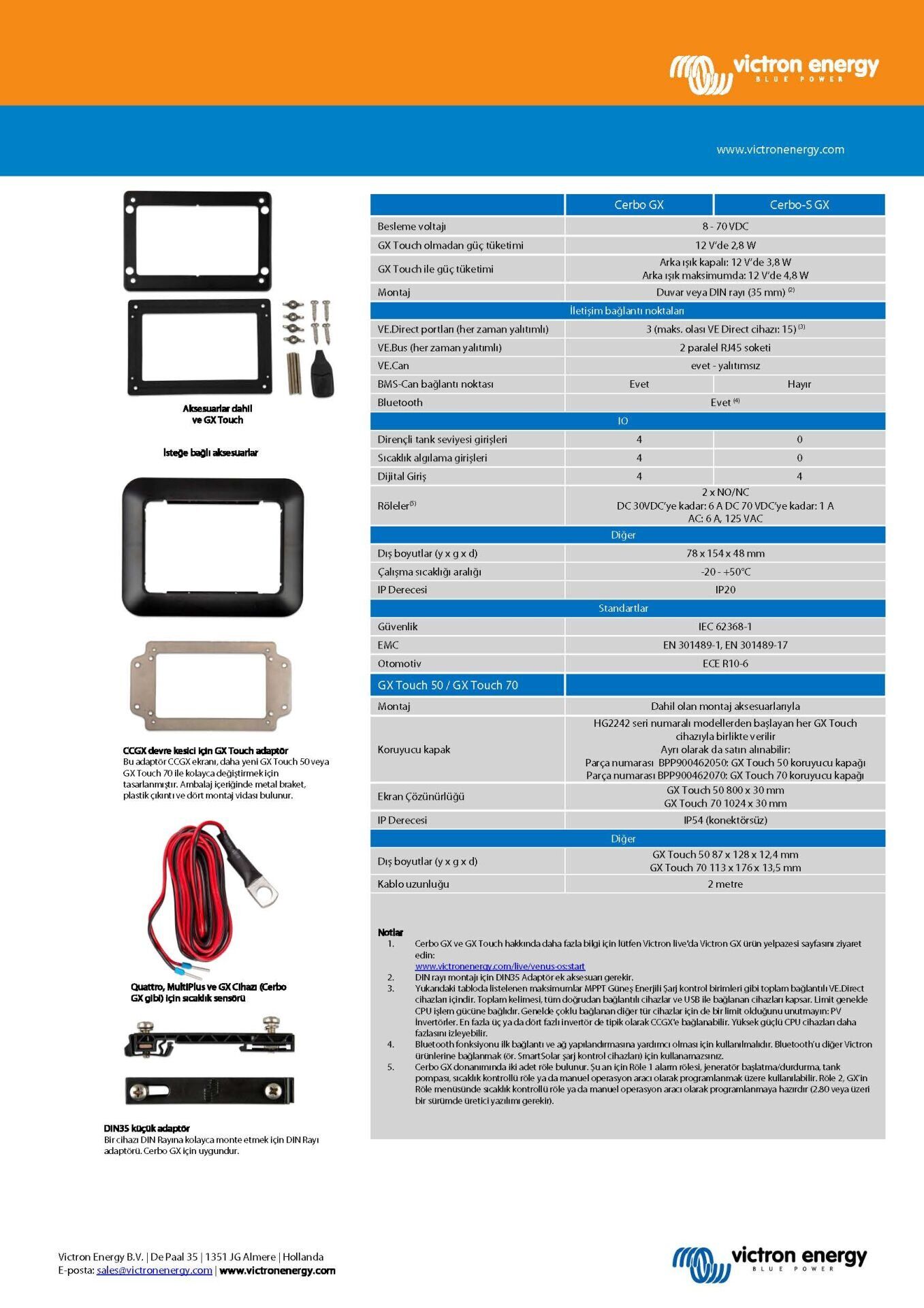 GX Touch, Cerbo GX ile birlikte kullanılan bir üründür; tamamen yeni olan iletişim merkezi, nerede olursanız olun sisteminiz üzerinde her zaman tam kontrole sahip olmanızı sağlar ve performansını en üst seviyeye çıkarır. Victron Uzaktan Bağlantı Yönetimi (VRM) portalımız üzerinden kolayca bağlanın veya GX Touch, MFD olan dahili dokunmatik ekranı kullanarak doğrudan erişin veya dahili WiFi Access Point özelliğiyle VictronConnect uygulamamız ile doğrudan erişim sağlayın. GX serisine eklenen bu son ürün, akıllı güç çözümlerini her açıdan yeniden tanımlayarak bağlanabilirliğe ilişkin en iyi özellikleri bir arada sunuyor.
