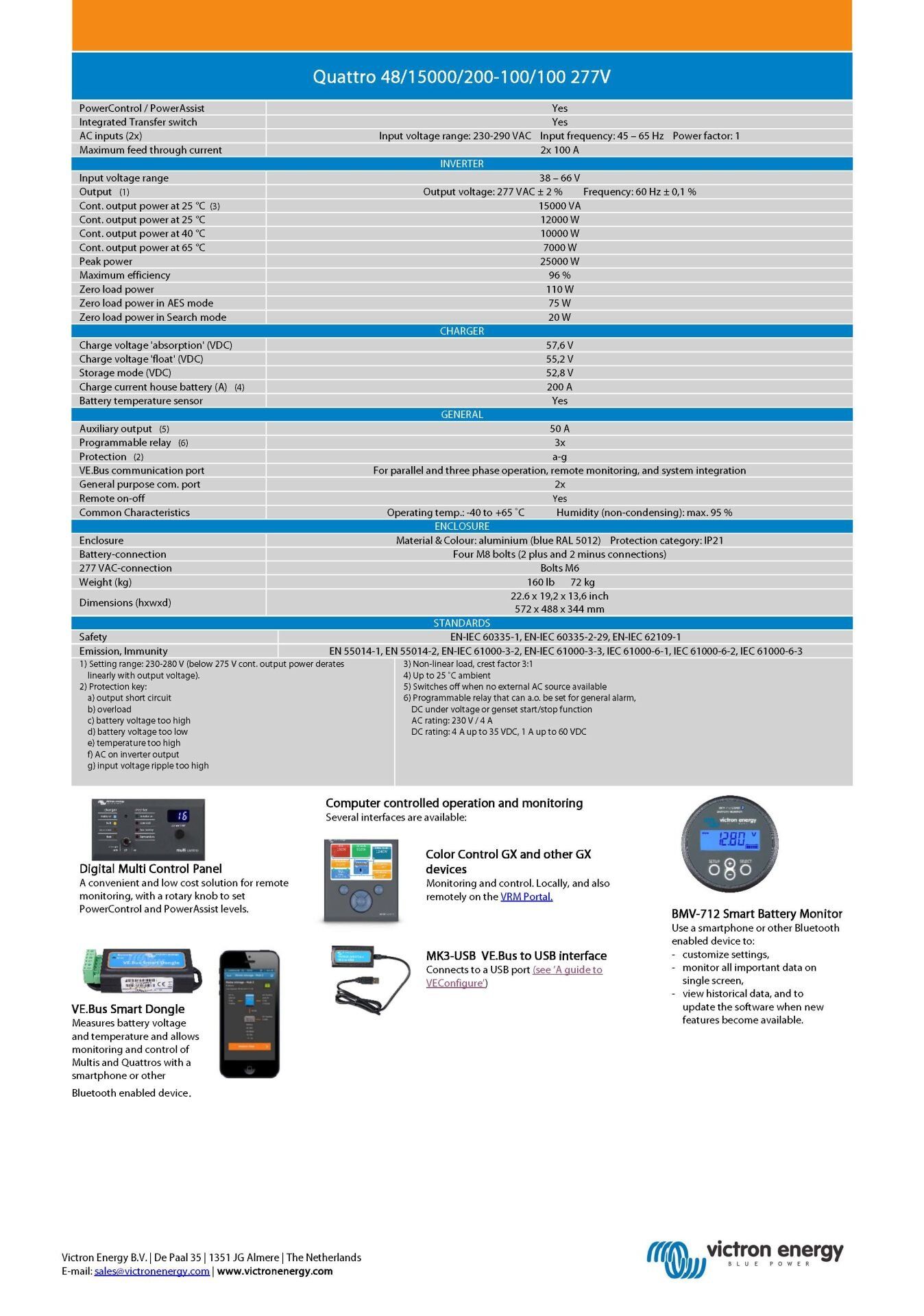 MultiPlus'a benzer şekilde Quattro da birleşik bir invertör ve şarj cihazıdır. Ayrıca iki AC girişini kabul edebilir ve otomatik olarak aktif kaynağa bağlanabilir. Birçok özelliğinden bazıları gerçek sinüs dalga invertörü, adaptif şarj, hibrit PowerAssist teknolojisi ve ayrıca üç fazlı veya ayrılmış fazlı çalışma ve paralel çalışma gibi çoklu sistem entegrasyonu özelliklerini içerir.