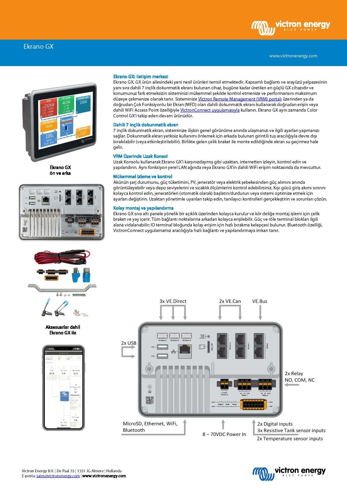 Victron Energy Ekrano GX ,GX ürün ailesindeki yeni nesil ürünleri temsil etmektedir. Kapsamlı bağlantı ve arayüzü yelpazesinin yanı sıra entegre 7 inçlik dokunmatik ekranı bulunan cihaz, bugüne kadar üretilen en güçlü GX cihazıdır ve konumunuz fark etmeksizin sisteminizi mükemmel şekilde kontrol etmenize ve performansını maksimum düzeye çekmenize olanak tanır.