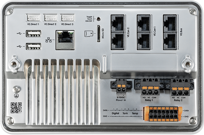 Sisteminize Victron Uzaktan Bağlantı Yönetimi (VRM) portalıüzerinden ya da bir Çok Fonksiyonlu Ekran (MFD) olan dahili dokunmatik ekranı kullanarak doğrudan erişin veya dahili WiFi Access Point özelliğiyle VictronConnect uygulamamızı kullanın.