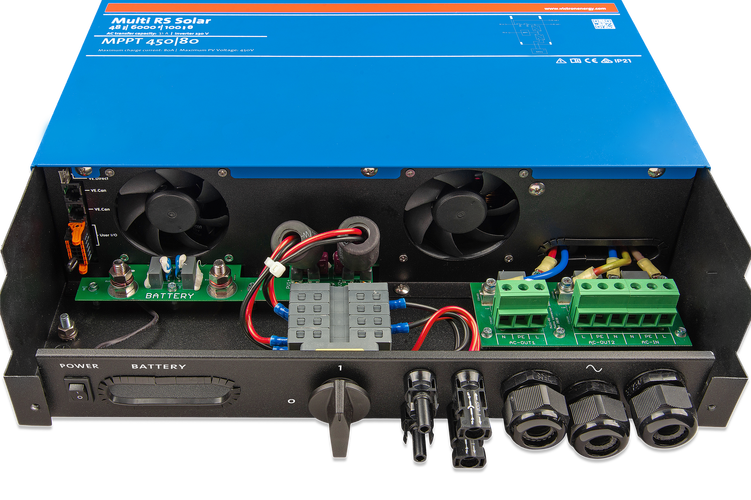 Multi RS Solar 48/6000, toplamda 6 kWp PV değeri için iki adet 3 kWp PV 450 V MPPT bağımsız izleyici girişine sahip olan 48 V 6 kVA’lık bir İnvertör/Şarj Cihazıdır.