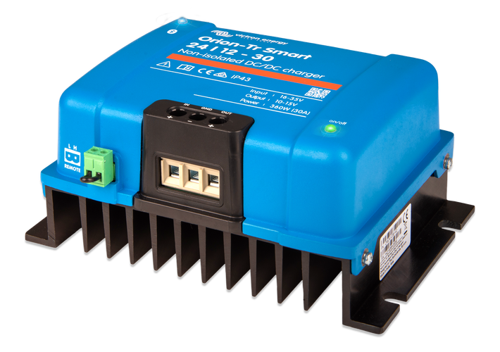 Orion-Tr Akıllı DC-DC şarj aleti, 3 aşamalı ve Bluetooth özellikli profesyonel bir DC-DC şarj cihazıdır. Servis akülerinin alternatör ve marş aküsüyle şarj edildiği taşıtlardaki veya su taşıtlarındaki çift batarya sistemleri için tasarlandı. Ünite Bluetooth üzerinden izlenebilir ve programlanabilir, bir açma/kapama anahtarıyla uzaktan kontrol edilebilir. Orion-Tr Smart şarj cihazı 12 V ve 24 V sistemlerde kullanılabilir. Hem kurşun asit, hem de lityum bataryalara uygundur. 400 W değerine kadar modeller mevcuttur, çıkış gücünü artırmak için sınırsız sayıda birim paralel bağlanabilir. Tam çıkış gücünü 40°C sıcaklığa kadar korumakla birlikte, ürün 55°C sıcaklığa kadar kullanılabilir.