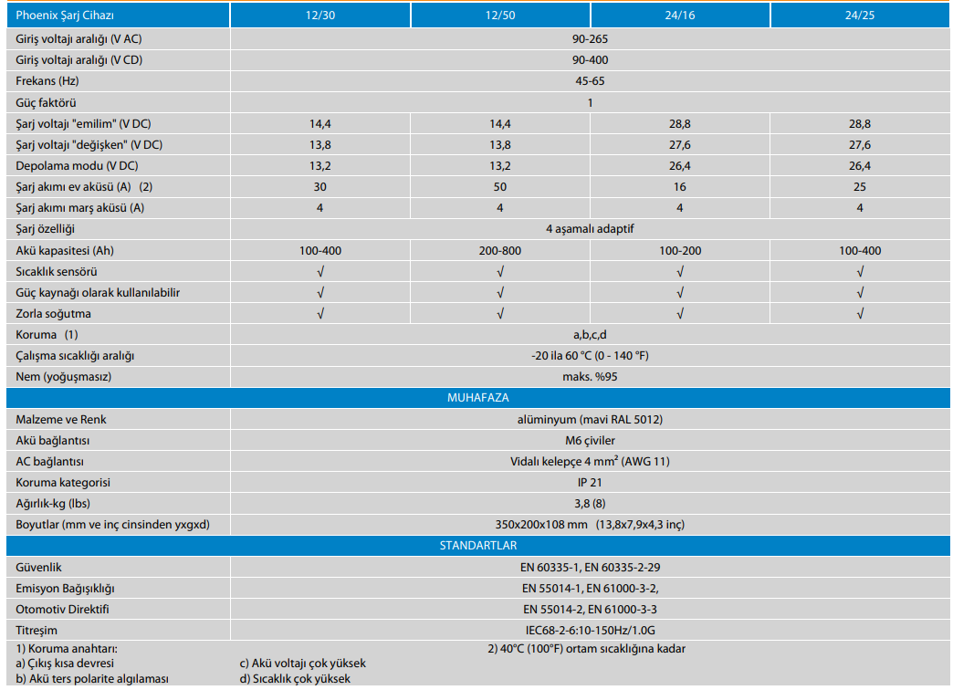 50A | 200-800 Ah | 45-65 | 4 aşamalı adaptif | 350 x 200 x 108 mm | 3,8 Kg |