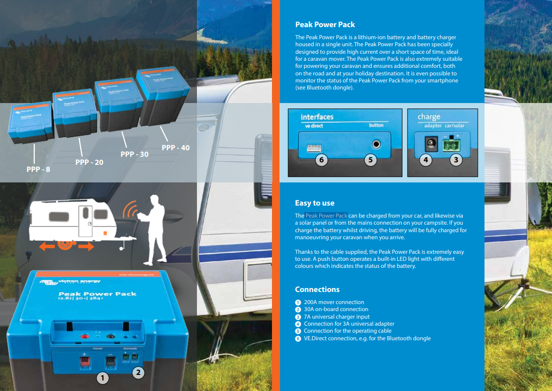 Pik Güç Paketi, yüksek akımların kısa zamanda oluştuğu uygulamalarda, ağır kurşun asitli akülerin yerine kullanılan eksiksiz bir yedektir. Esas olarak karavan taşıyıcılar için sunulan bu paket, karavanla hareket halindeyken araç elektrik sistemi üzerinden şarjı olanaklı kılan entegre şarj cihazı ile donatılmıştır. Böylece, kamp alanına varıldığında, paket tamamen şarj edilmiş durumda olur. Gerekli görüldüğünde, sağlanan adaptör yardımıyla şebeke çıkışı üzerinden şarj edilebilir. Güneş paneli üzerinden şarj etmek de mümkündür. Peak Güç Paketi; 4 Modelden Oluşur 1- PPP-8 : 12.8 V /8 Ah 2- PPP-20 : 12.8 V / 20 Ah 3- PPP-30: 12.8 V / 30 Ah 2- PPP-40: 12.8 V / 40 Ah Peak Power Pack bir lityum-iyon pil ve şarj cihazıdır. Tek bir ünitede yer almaktadır. Peak Power Pack özel olarak kısa sürede yüksek akım sağlamak için tasarlanmış, ideal bir karavan taşıyıcısı için. Peak Power Pack ayrıca son derece uygundur. Karavanınıza güç vermek ve her ikisine de ilave konfor sağlamak için yolda ve tatil yerinizde kullanabilirsiniz. Peak Power Pack’in durumunu akıllı telefonunuzdan izleyebilirsiniz. Peak Power Pack’i aracınızdan şarj edebileceğiniz gibi, kamp yerindeki 220 den de şarj edebilirsiniz. Hatta güneş panelinden veya karavanınız yolda giderken şarj edilebilir. Kullanımı oldukça kolay ve pratiktir.