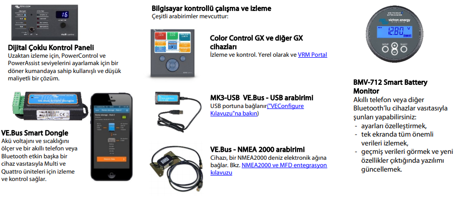 Çeşitli seçenekler mevcuttur: Battery Monitor, Multi Control Panel, Color Control GX ve diğer GX cihazları, akıllı telefon veya tablet (Bluetooth Smart), dizüstü bilgisayar veya PC (USB veya RS232).