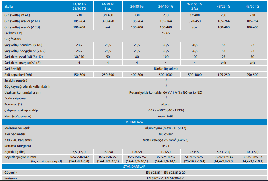 | Giriş Voltajı | Şarj Voltajı | Şarj Akımı | Akü Kapasitesi | Frekans | Şarj Özelliği | Ölçüler | Ağırlık |
